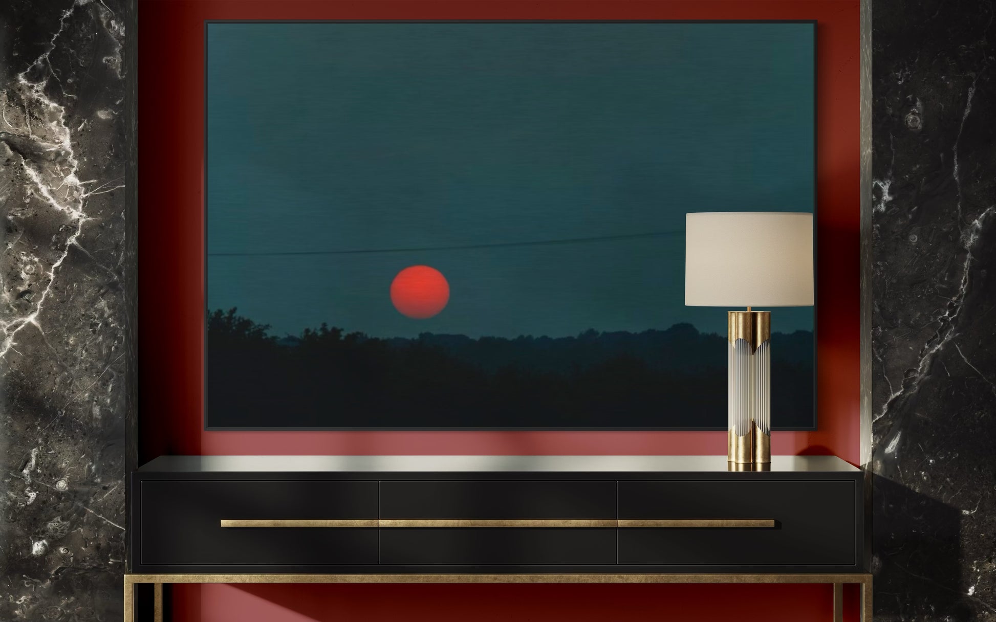 The sun is hanging low. A fading ember, glowing at the edge of day. End of the day, summer warmth bouncing along the tree line, before it says goodbye for the day. A nearly night sky, washed in surreal green light, where darkness and light hold each other in a fragile pause.